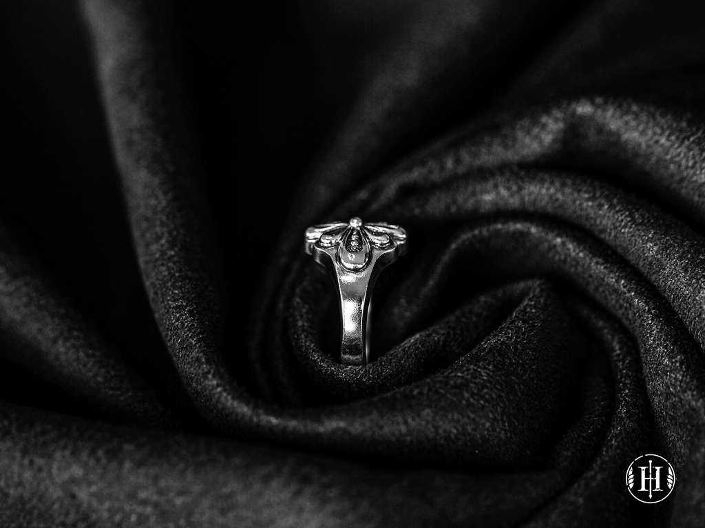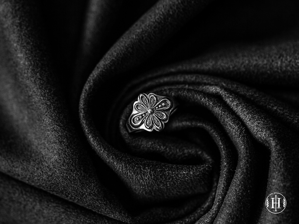 以花卉精細雕鑿,呈現於戒指中,貫穿整體概念的Hiota星空鑿點,